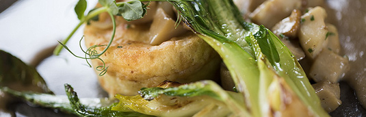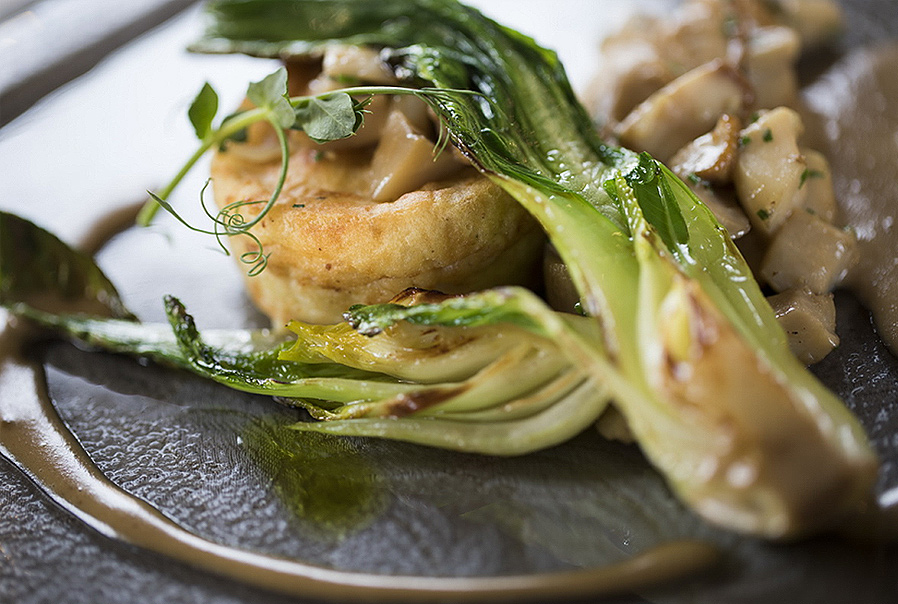 Potato fondant with roasted mushrooms, mushroom sauce and roasted chocolate flank