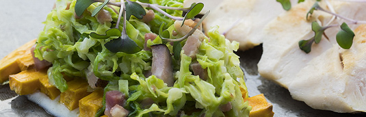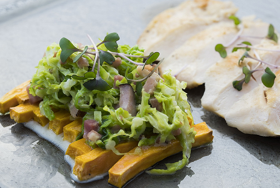 Filleted chicken breast, cabbage ragout, roasted French fries